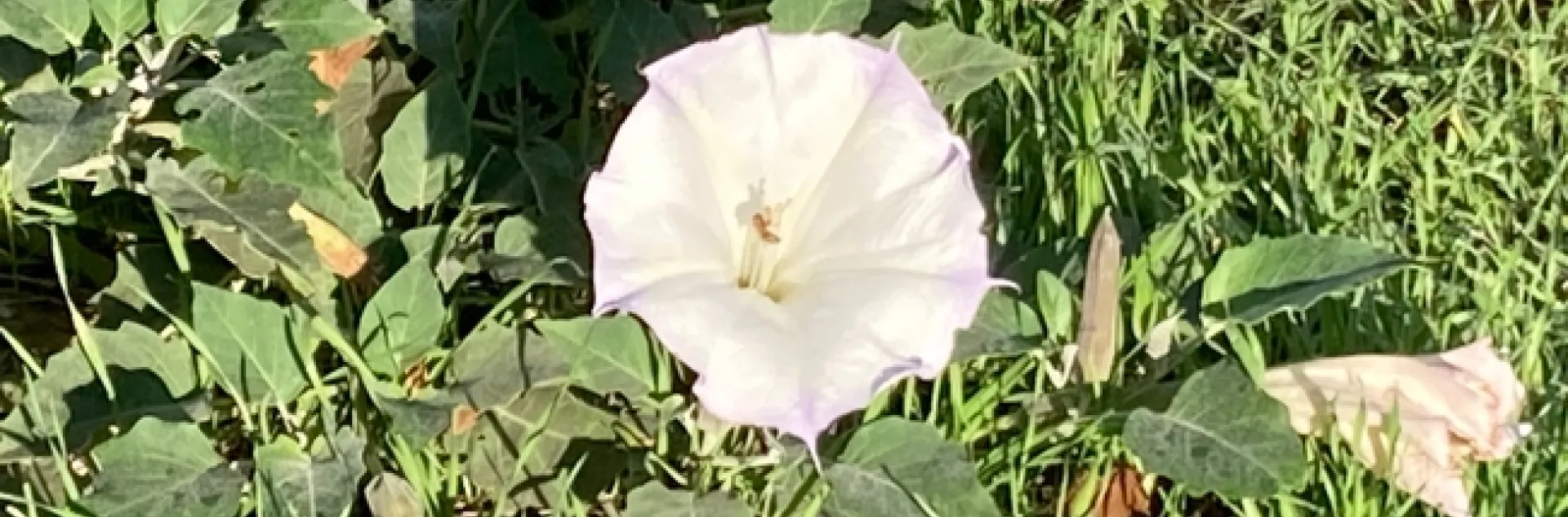 Datura wrightii is the plant most commonly seen in California fields and gardens. It is a short-lived perennial producing large, upright, mostly white, fragrant flowers that bloom from spring to frost and from late afternoon to about noon the next day. The flowers are pollinated by moths mostly and some bees. The plant capsule starts out green and spiky and then splits open to spread its seed. While the plant leaves look velvety, they are covered with tiny hairs that are a skin irritant to some, as also is the sap released when the leaves are crushed. The crushed leaves are also stinky. The plant dies with the frost, but all the dispersed seeds ensure a new life come spring.