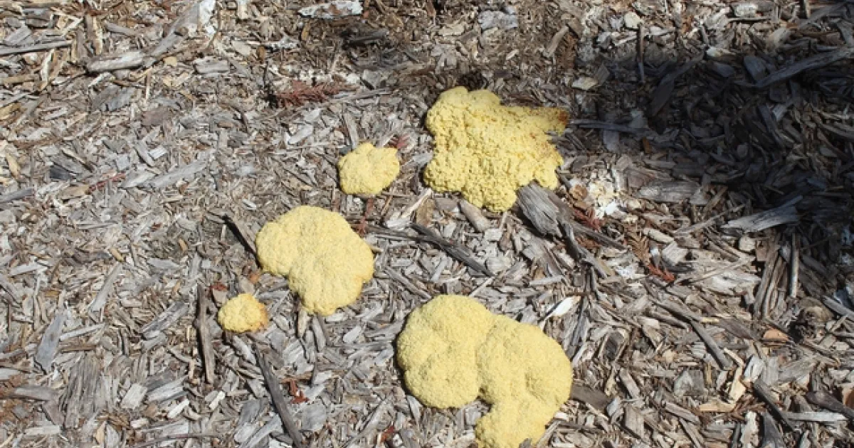 The slime mold was feeding off the fungus and bacteria in the soil which in turn were decomposing the copious amounts of wood chips. It was Nature's recycling project at work! They are relatively harmless and pose no threats to plants, pets, and people. It can appear anytime from late Spring to Fall. It thrives in moisture and heat environments. Slime mold can be in other colors, such as orange or blue but rarely green, than dog vomit yellow.