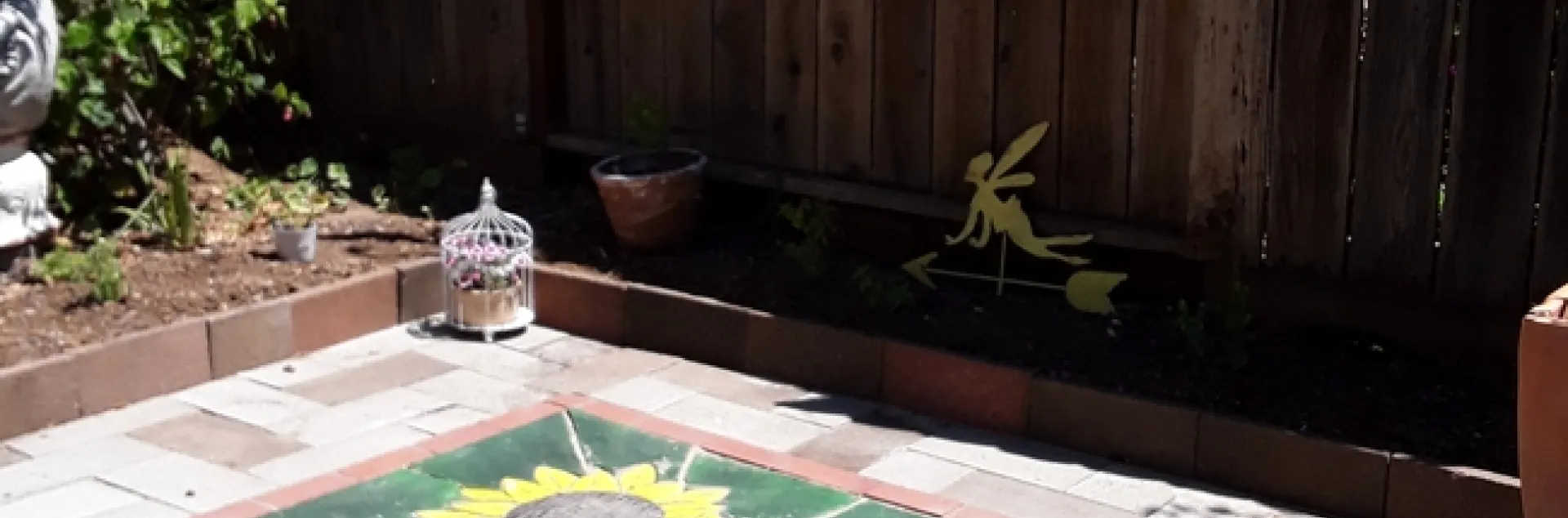 So, I asked my granddaughter's husband, Peter, if he would enlarge the paving area back to the fence. This got rid of the unsightly area and made that side of the yard mostly drought-tolerant except for an area where a small pollinator garden exists. The hummingbirds, butterflies, and bees love where I have salvias, iris, cornflower, a barrel containing an art piece, and lavender growing. By enlarging the unsightly, corner this part of the yard is easier to maintain and took at.