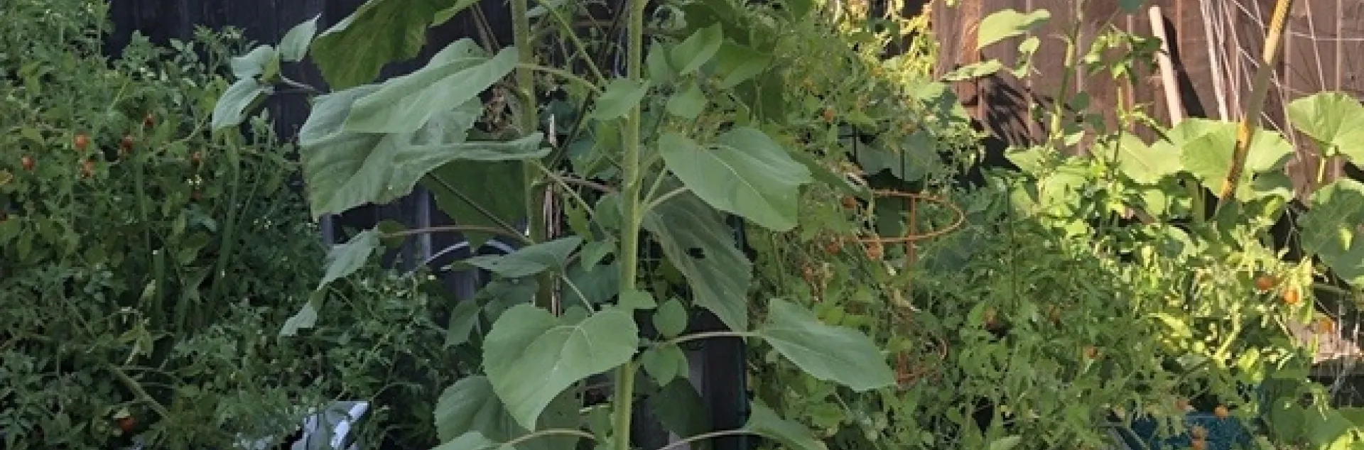 The sunflowers grew and grew! I quickly figured out that seepage from the raised bed provided their water source. But growing in compacted gravel and not soil? This was new to me. I didn't have the heart to pull them out when they were trying so hard to grow under adverse conditions and so I left them in place as an experiment. It turns out that sunflowers aren't fussy about soil conditions as long as the location is well-drained. Of course, the plants will better reach their maximum potential with better, nutrient-rich soil.