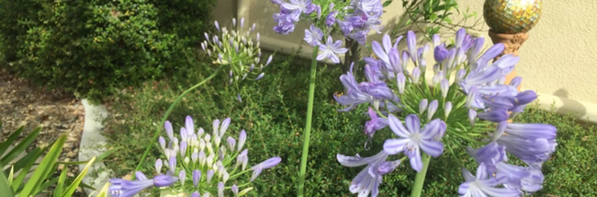 Agapanthus (Agapanthus Africanus) are beautiful perennials that thrive in Solano County and over most of Northern California. They hold their flowers well above the strappy leaves on stalks sometimes 3 feet high. Their blooms are part of clusters, usually in a spherical shape, looking a little like a globe-shaped fireworks display. They come in shades of blueish purple and white, as well as pink ones found in some of the perennial catalogs.