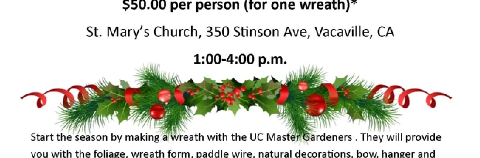 November 25, 2018By Jennifer M Baumbach Print Join the UC Master Gardeners of Solano County and learn how to make a beautiful wreath from fresh greens. Space is still available. See flyer for more details.