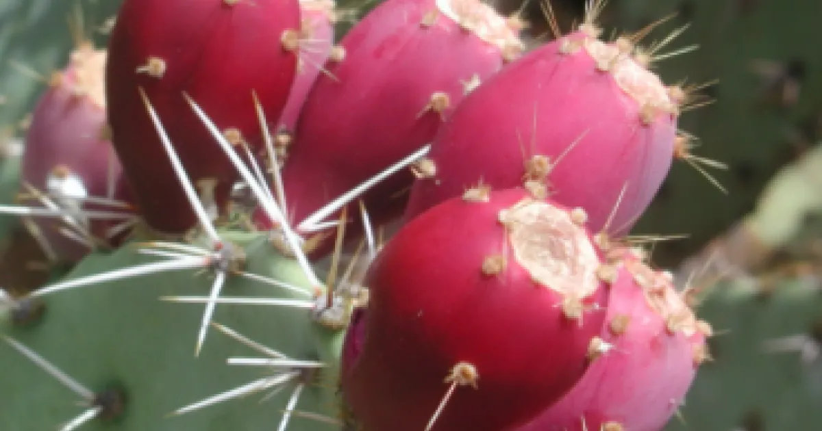 I love this cactus for its fruit. It's a jolly red color when it's ripe. To pick the fruit you need to be very careful! It's spiny! First, you have to chop the tuna off the plant. Bring a long, sharp knife. I use two sets of goat gloves (the spines are very small and get into your skin). And newspaper inside of a bag to transport them.