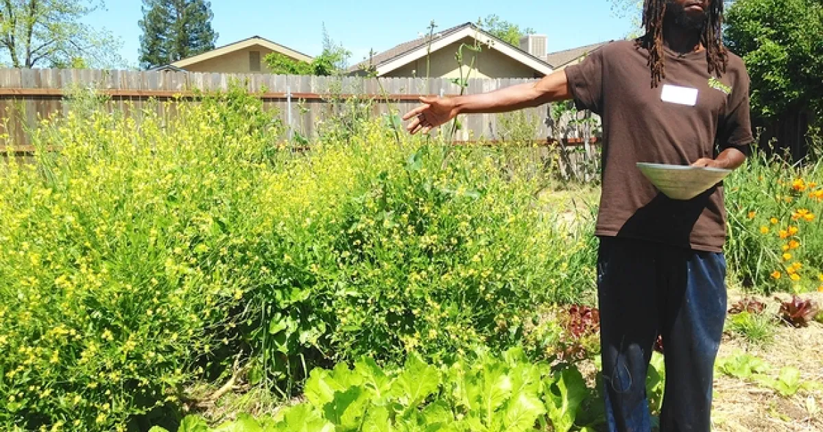 Yisrael Family Urban Farm is located on a double lot in the South Oak Park neighborhood of Sacramento, at the home of owners Judith and Chanowk Yisrael. South Oak Park is one of Sacramento's underserved communities; it has been called a “food desert,” with more fast food outlets than places selling healthy food. The half-acre farm currently includes a front-yard food forest with healing and culinary herbs, more than 40 fruit trees, rows of vegetable beds, herbs, a small flock of chickens, worm composting bins, beehives and a high tunnel hoop-house used for giving seedlings an early start in cold winter months. Yisrael Farm also makes space for community gatherings with welcoming tables and a circle of tree stumps and seats around a fire pit on a grassy area. The farm is home to many gardening and cooking workshops and other community gatherings.