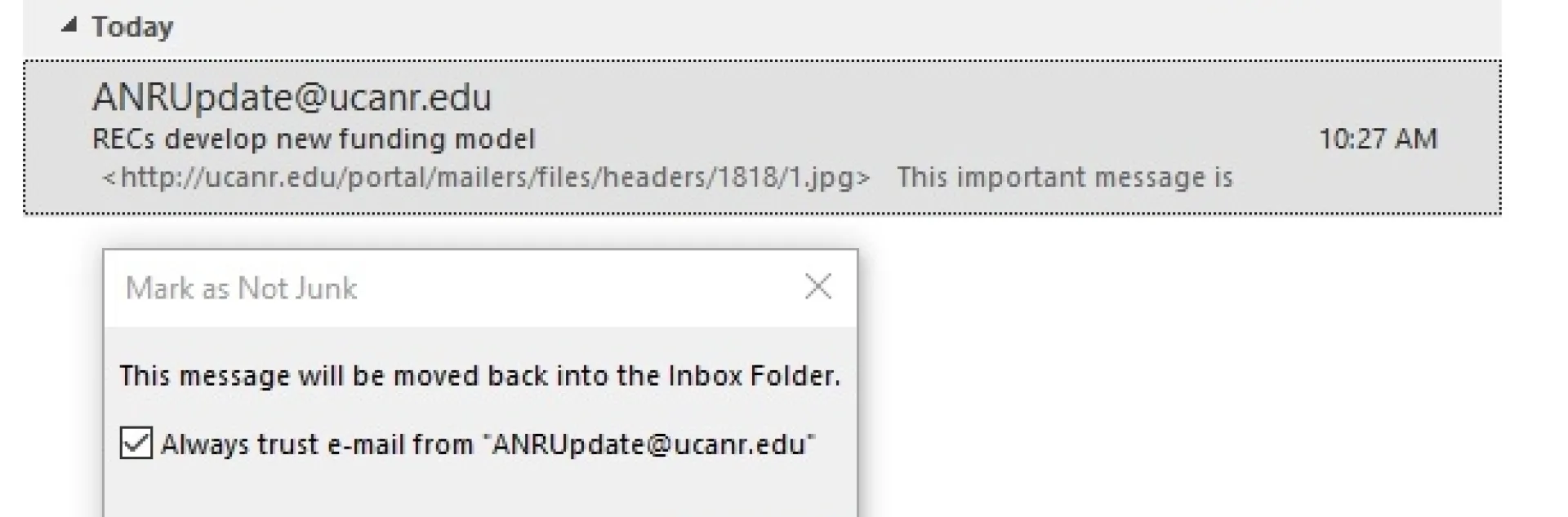 - Do this for common ANR email senders, including for example “anrupdate@ucanr.edu,” “help@ucanr.edu,” and “no-reply@ucanr.edu.”