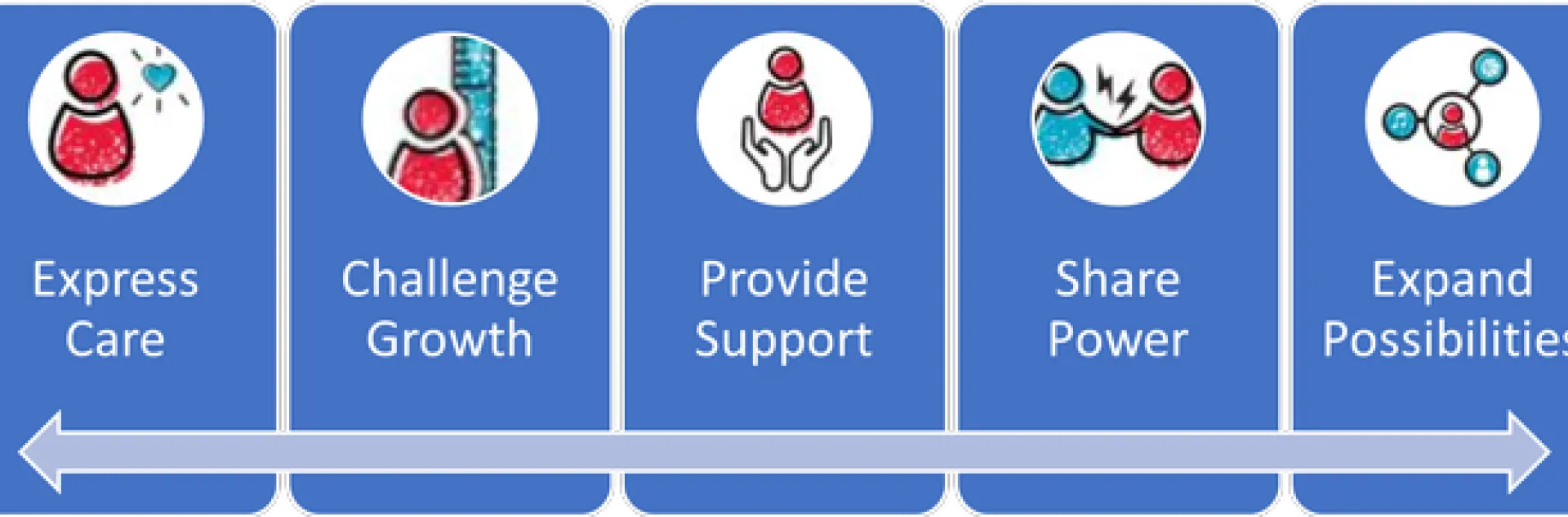 One of the leading youth development research organizations, The Search Institute, conducted more extensive research and developed the Developmental Relationships Framework to illustrate how adults can build and foster positive relationships with young people in our communities.