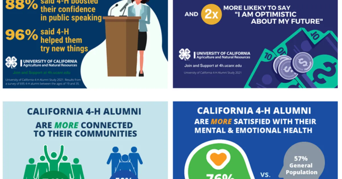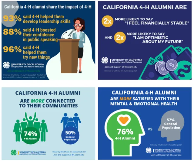 The results of this study showed that California 4-H alumni had many positive long-term outcomes from involvement in the California 4-H Youth Development Program. When compared with a U.S. general population who had not participated in 4-H, the 4-H alumni demonstrated more positive long-term outcomes in each of the three areas. Not only did 4-H alumni report a strong sense of community, better physical and mental health, and feeling more financially stable – they also confirmed that 4-H helped them develop leadership, public speaking, and other real-world skills.