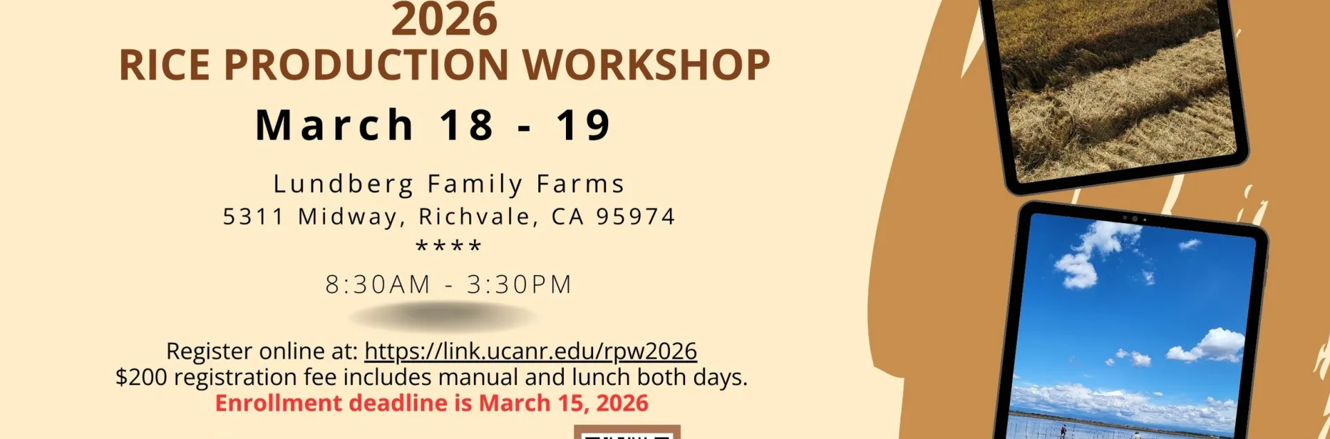 UC Cooperative Extension will host the 2026 Rice Production Workshop on March 18–19, 2026, from 8:30 a.m. to 3:30 p.m. at Lundberg Family Farms in Davis, CA.