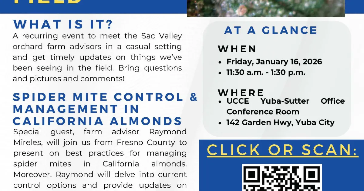 Join us for the Third Friday Things in the Field meeting on Friday, January 16, 2026, from 11:30 a.m. to 1:30 p.m. at the UCCE Yuba-Sutter Office. Special guest Raymond Mireles, UC Farm Advisor (Fresno County), will present on spider mite management in California almonds, including best practices, current control options, and research updates. The meeting will conclude with a roundtable discussion covering current field issues across all tree crops. Lunch is provided; registration is required.