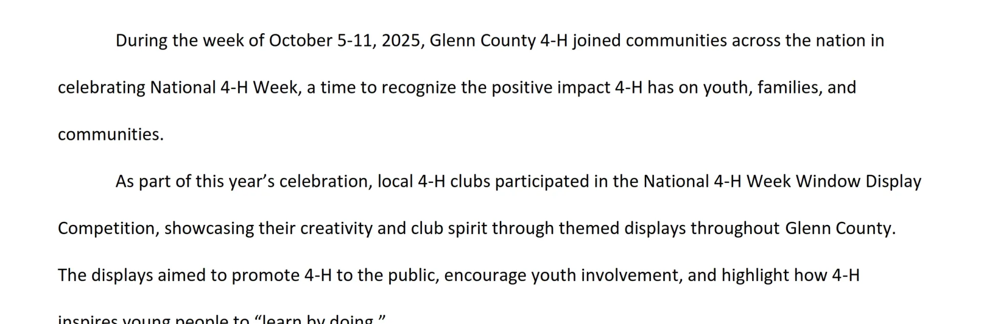 During the week of October 5-11, 2025, Glenn County 4-H joined communities across the nation in celebrating National 4-H Week, a time to recognize the positive impact 4-H has on youth, families, and communities.
