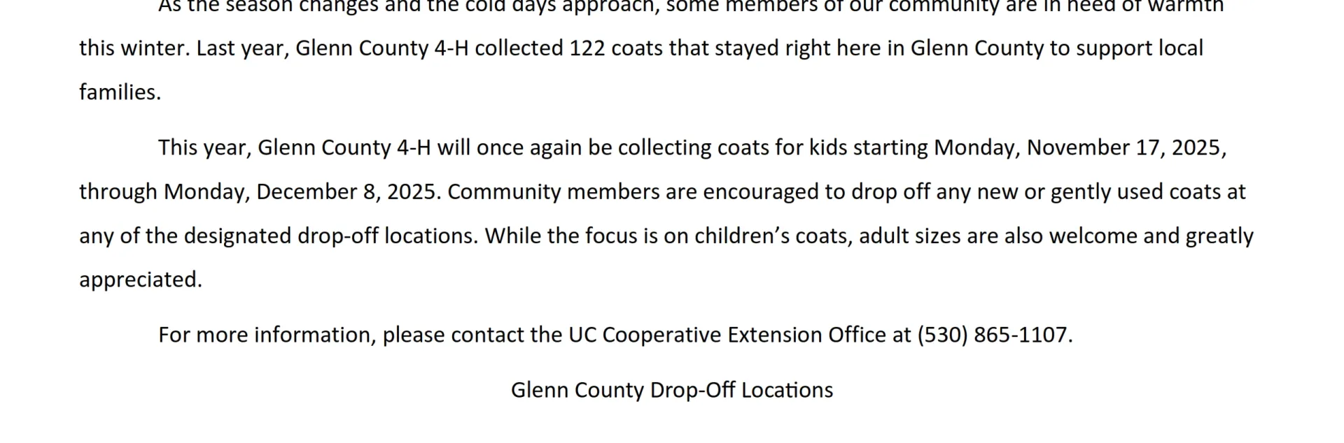 This year, Glenn County 4-H will once again be collecting coats for kids starting Monday, November 17, 2025, through Monday, December 8, 2025. Community members are encouraged to drop off any new or gently used coats at any of the designated drop-off locations. While the focus is on children’s coats, adult sizes are also welcome and greatly appreciated.
