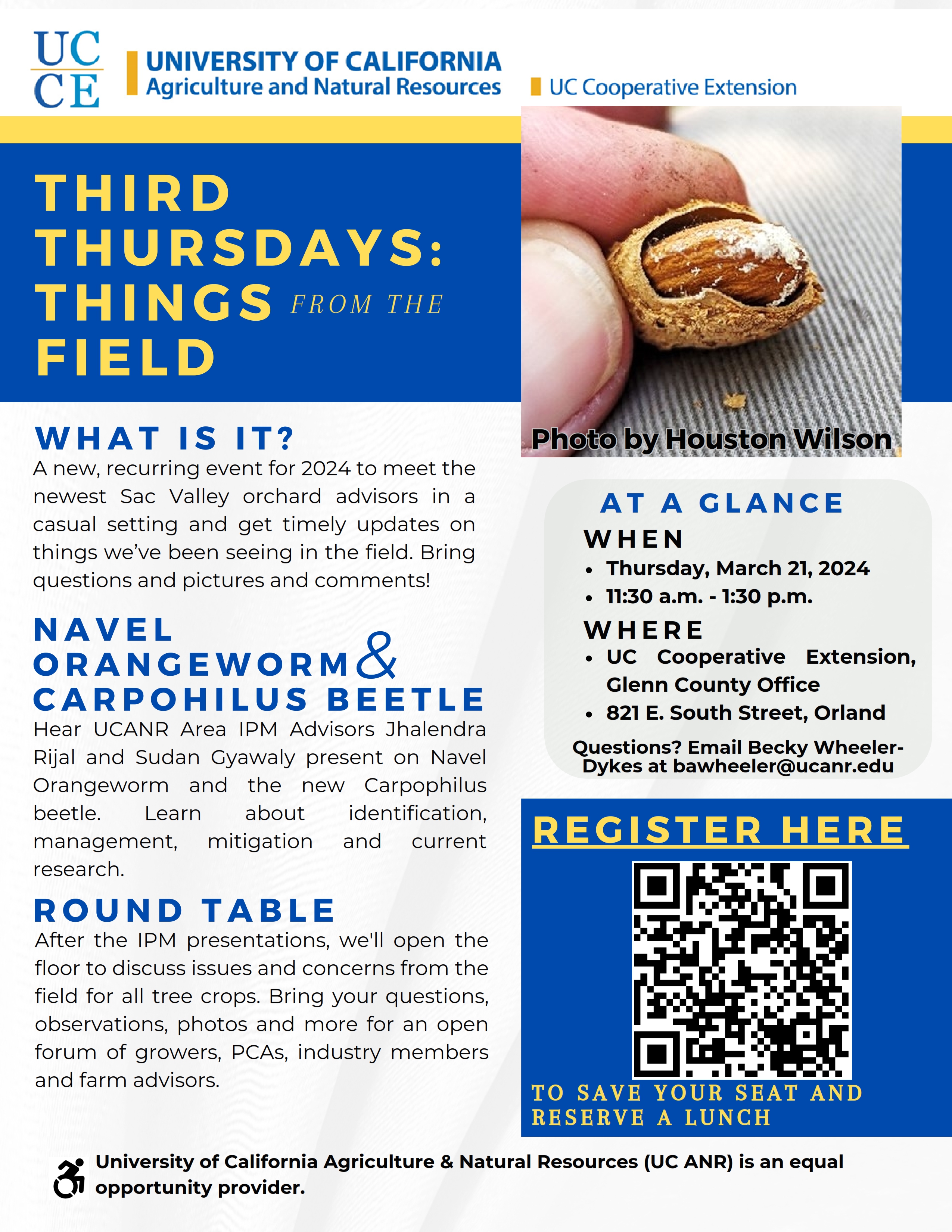 Third Thursday Things from the Field Meeting Announcement - Thursday, March 21, 2024, from 11:30 a.m. to 1:30 p.m. at the UC Cooperative Extension Office, 821 E. South Street, Orland, CA 95963. Any questions, email Becky Wheeler-Dykes at bawheeler@ucanr.edu, or call the UCCE Office at (530) 865-1107.
