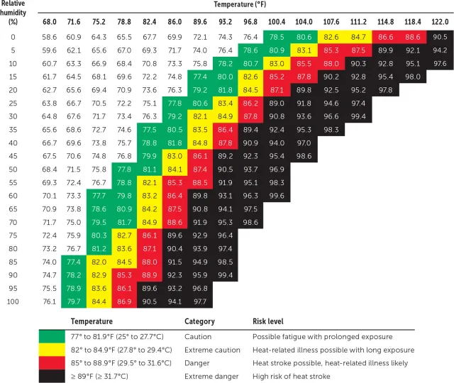 Figure 1: (a) Wet Bulb Globe Temperature (WBGT). Wet bulb globe temperature based on temperature and humidity, assuming a clear sky (maximum solar load) and atmospheric pressure of 1 ATA (760 mm Hg). Source: Gauer, R., & Meyers, B. K. (2019). Heat-related illness
