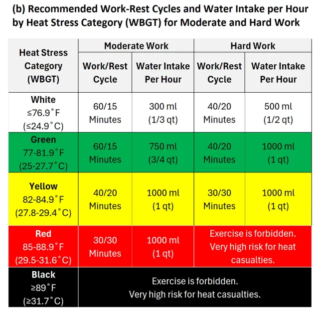 Figure 1:(b) Ariel's checklist, Heat Stress Category (WBGT) and Work/Rest Cycle & Water Intake Per Hour Recommendation. Source: Ariel’s Checklist; This chart was developed by Professor Yoram Epstein to be used for the hikers. https://arielschecklist.com/wbgt-chart
