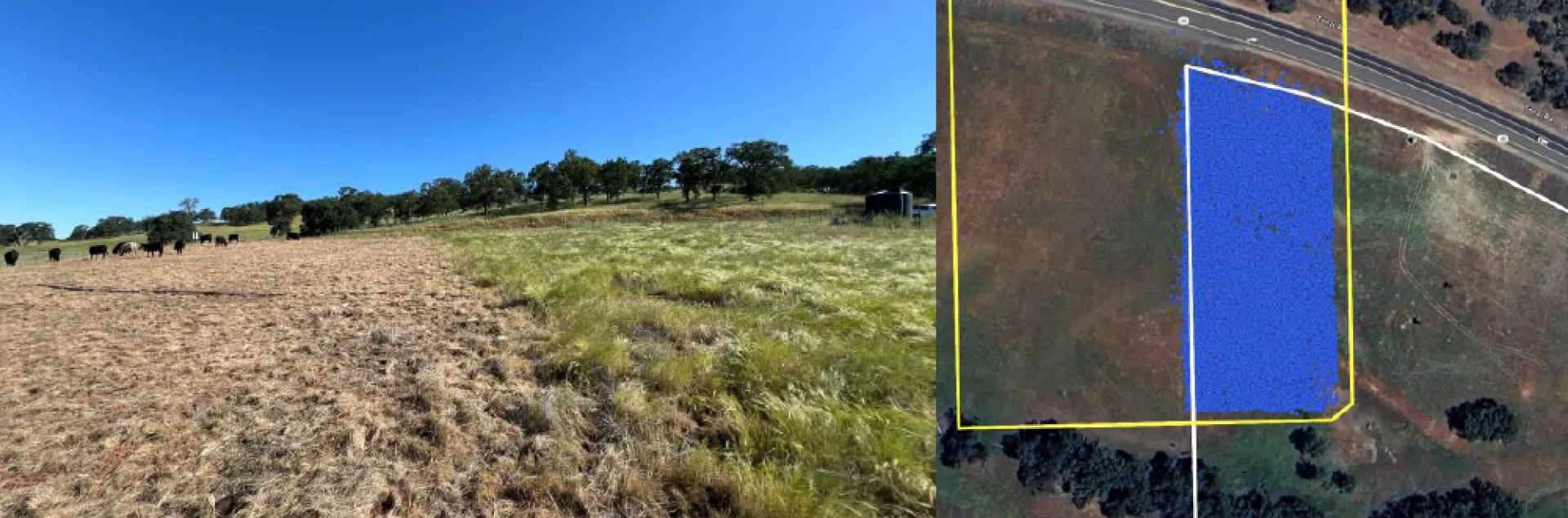 Figure 1. Left: The viewer's left demonstrates the impact of high-intensity, short duration grazing on immature medusahead, contrasted with the ungrazed control area showing high levels of medusahead infestation, identifiable by its glossy yellow green color. The VF boundary is visualized by a line in the pasture that the animals are trained not to cross. Right: VF collar location data (blue dots) during the trial. The VF boundary is represented by a yellow line and the barbed wire fence is represented by a white line.
