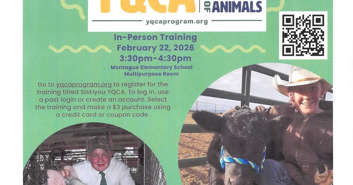 YQCA training is required for all youth (8 years of age(as of 12/31/25) and older) who plan to exhibit animals at the Siskiyou Golden Fair. If you would like the opportunity to attend an in-person training we will be hosting a training Sunday, February 22nd at 3:30pm in the cafeteria/multipurpose room of the Montague Elementary School. Registration is required at https://yqcaprogram.org/ Select the Siskiyou YQCA training on 2/22/26. Cost of the in Person training is $3.00. All youth need to register and then take the pre-test. Once you have registered you will find the pre-test by clicking on your profile (blue button on upper right had side), then click on “Enrolled ILT Trainings”. You will then see the button that lets you take the pre-test. You can not print the certificate until you have completed the pre-test, attended the training and completed the post test. After the course you can take the post test and print your certificate by going to your profile, Select “Course Certificates”, complete the post test and then print your certificate. This is the only in-person class that we know of, if you do not attend the in-person training you will be required to do the web-based training for $12. You must remember to take this course before entry deadline for fair (June 5, 2026).