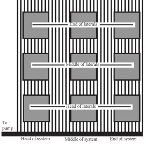 2. Sample drip emitters at the following locations. Download the DU worksheet to record emitter discharge in the field.