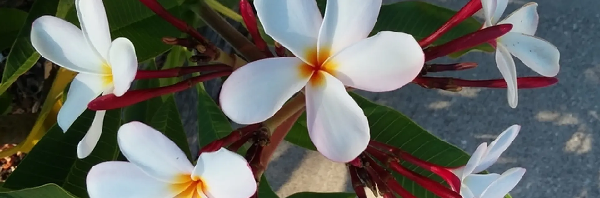Snapshot: Did you receive a lei in Hawaii and savor the scent? Plumerias may have been part of the lei, exuding a combination of jasmine, citrus and gardenia fragrance. Native to tropical America, the Plumeria genus is comprised of 11 species of shrubs and small trees. Branches are widely spaced, with thin, grey bark and milky sap when cut. They can be upright and compact, or open and sprawling. Fleshy leaves have an alternate pattern; shapes vary from round to pointed, glossy or smooth; positioned on the tips of the branches. Flowers are 2-4 inches in diameter and have five rounded, overlapping petals, in pink, red, white, and yellow color palettes. Fragrance may be strongest in the evening, to attract night-flying sphinx moth pollinators.