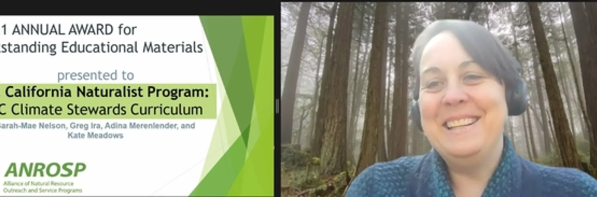 The UC California Naturalist Program was recognized with the 2021 ANROSP Outstanding Educational Materials Award for their UC Climate Stewards curriculum. This award recognizes ANROSP member programs for their development and use of educational materials including print, video, online technology, or other program materials/applications.