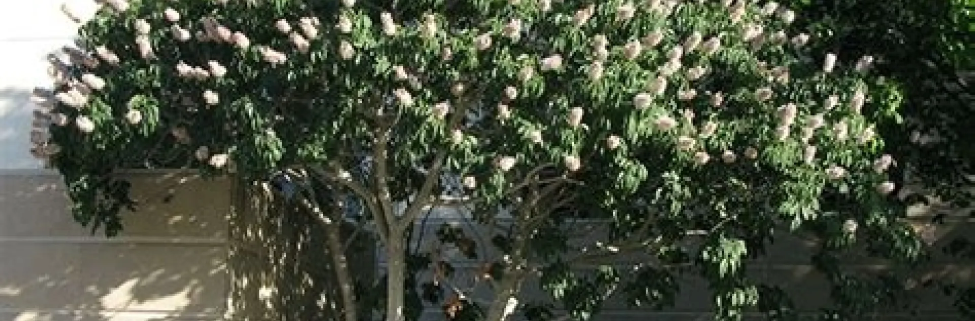The chitalpa (Chitalpa tashkentensis) was hybridized in 1964 in Tashkent, the capital of Uzbekistan, and brought to the U.S. in 1977. This tree is a cross between two U.S. native flowering trees, the Southern catalpa (Catalpa bignonioides) from the southeastern U.S. and the Southwestern desert willow (Chilopsis linearis). Flowers are light colored and fragrant. It is drought tolerant and can take full sun, but the bark can get sun scald.