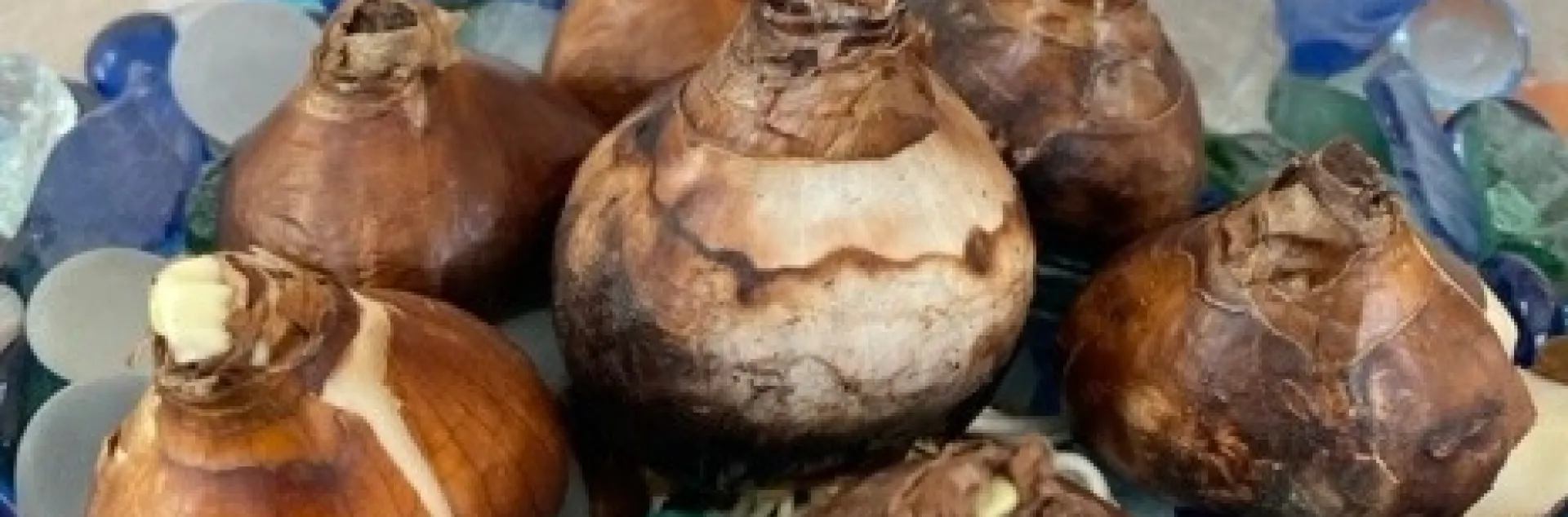• Place bulbs on top of the pebbles so that they are sitting upright with the pointed end up and the root scar down. The bulbs should be set so that they are stable and sitting upright but on top of the pebbles so that only the roots and very bottom of the bulb are in the water.