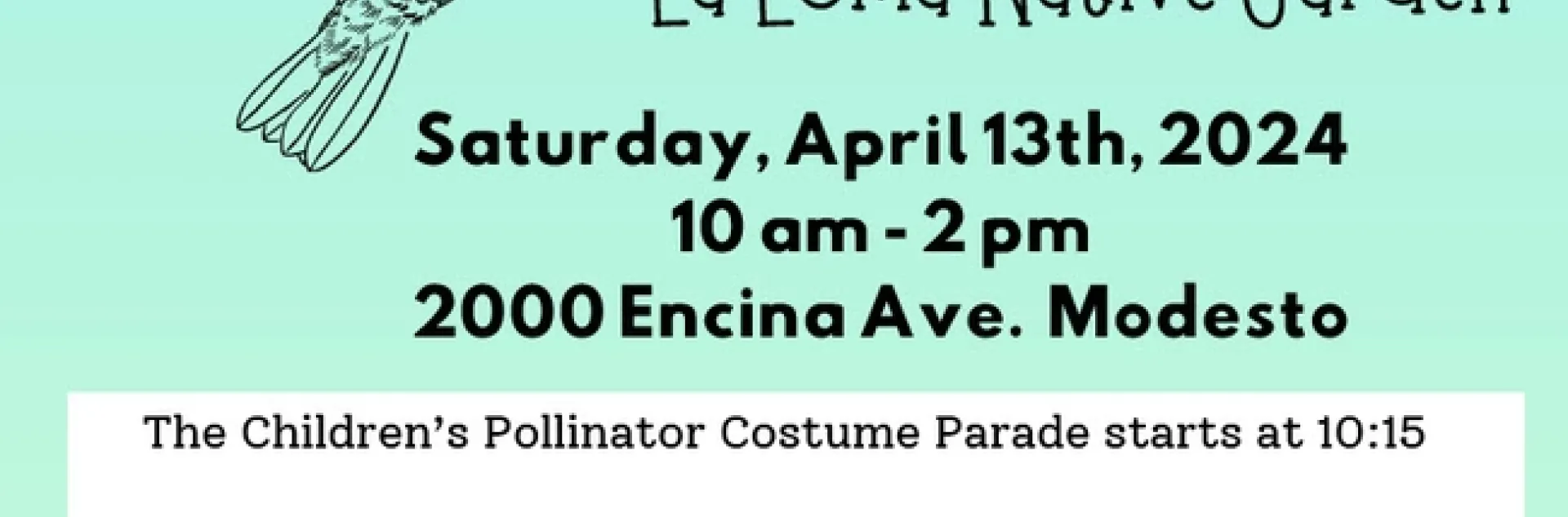 Put on your rain gear and join us this Saturday, Saturday, April 13th 2024 from 10am – 2pm at the Pollinator Festival. at the La Loma Pollinator Garden on 2000 Encina Avenue in Modesto.