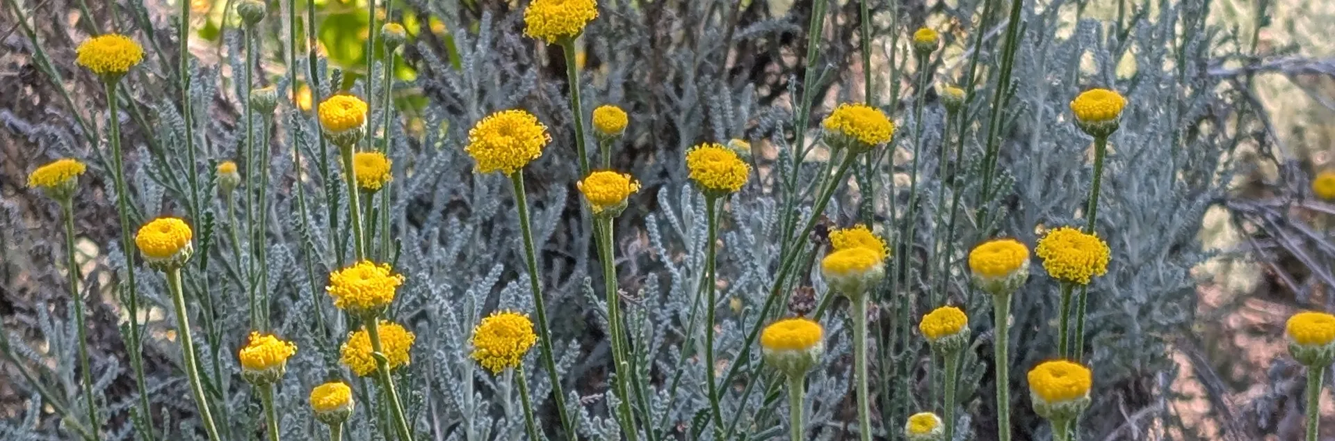 Santolina chamaecyparissus is most often grown for a silvery gray element in gardens and landscapes. Gray-green, evergreen foliage is nearly needle-like, similar to lavender, and highly pungent.