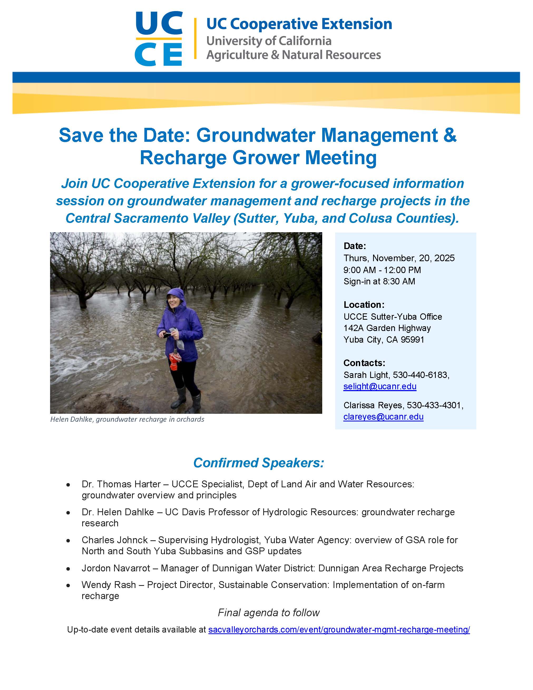 Join UC Cooperative Extension for a grower-focused information session on groundwater management and recharge projects in the Central Sacramento Valley (Sutter, Yuba, and Colusa Counties).