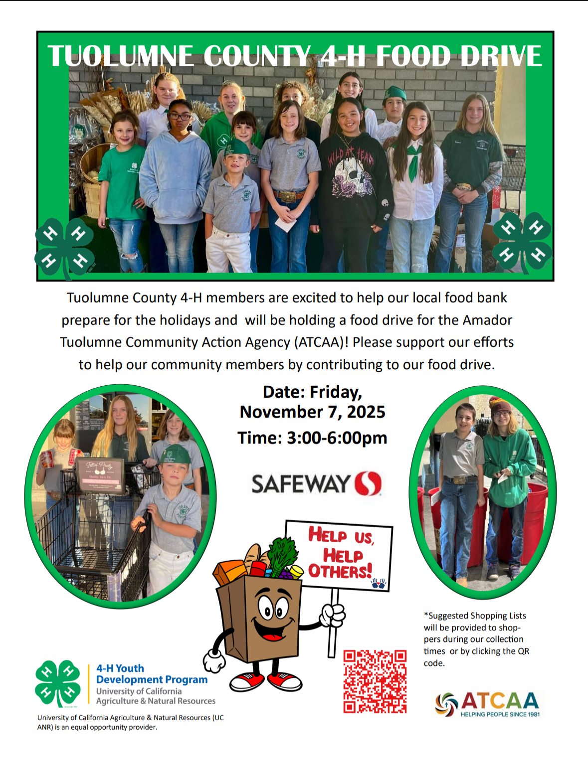 Tuolumne County 4-H will be holding their annual ATCAA food drive on Nov 7th, 3-6 PM.