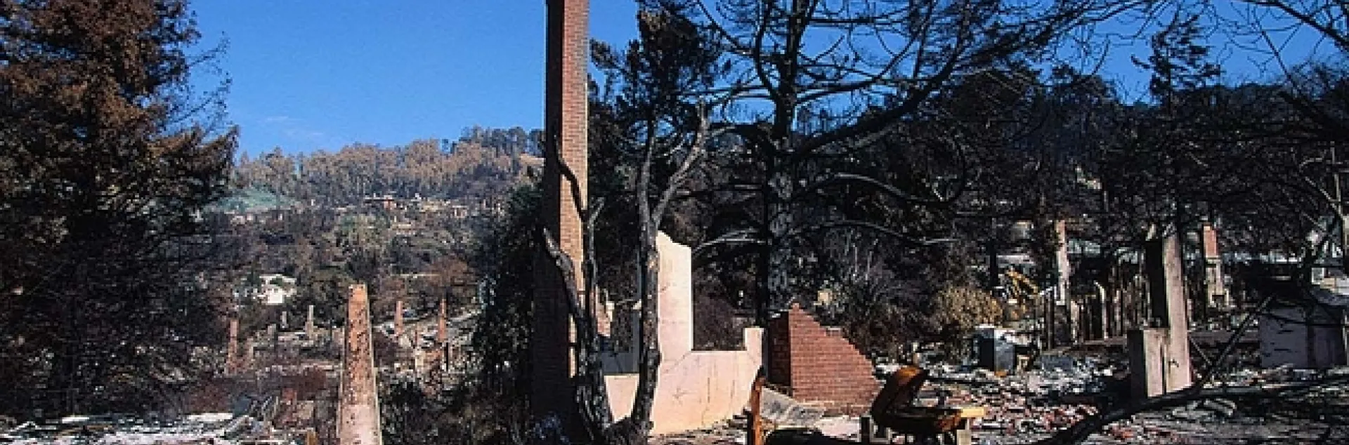 Fire damage from the 1991 Oakland Hills fire. Buildings can burn quickly if embers get inside and fall on flammable materials.