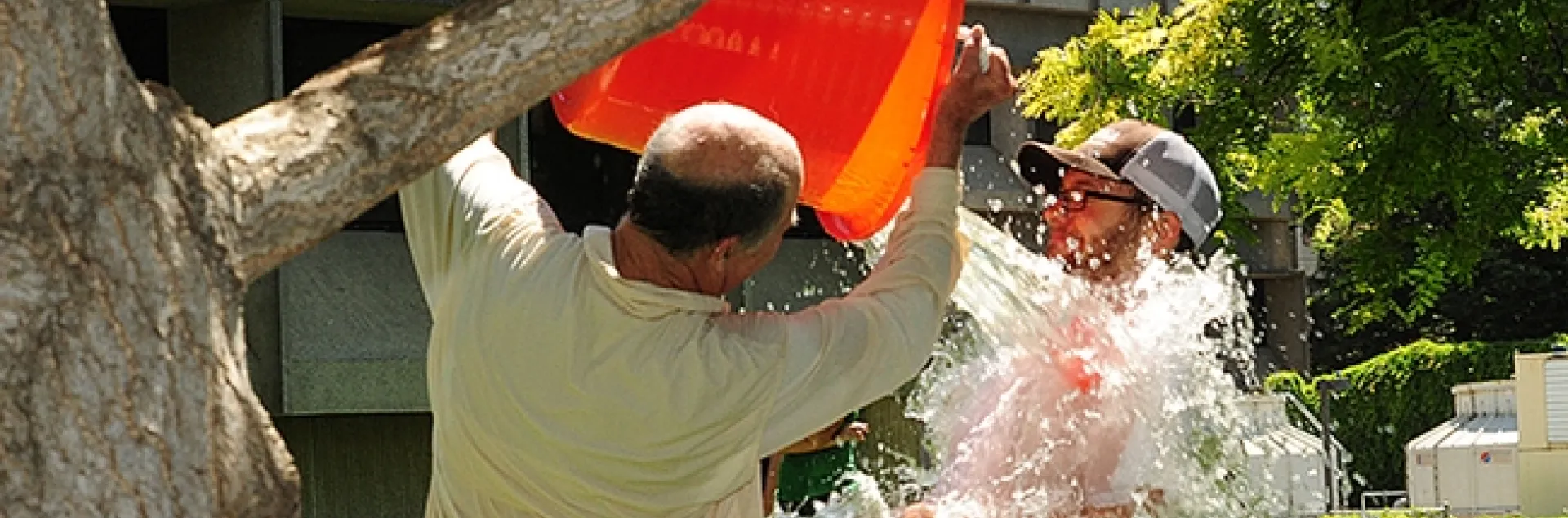 Water warrior Bruce Hammock dumps water on Kevin Cloonan, then a graduate student in the Walter Leal lab. (2012 photo by Kathy Keatley Garvey)