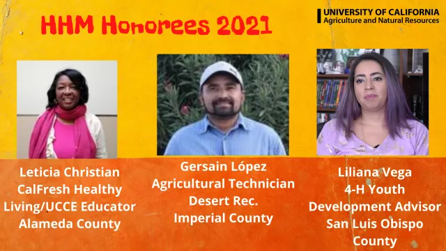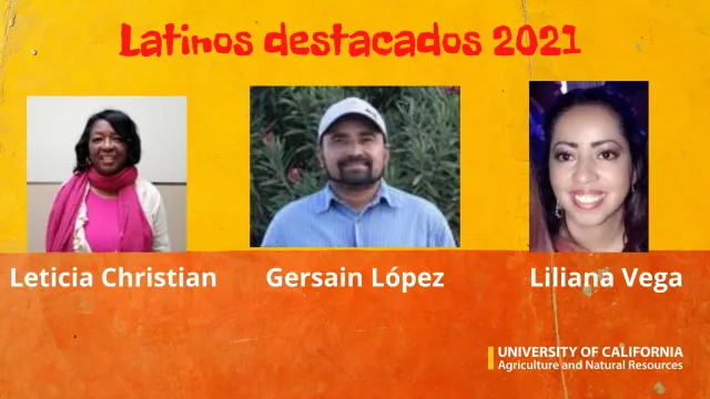 Liliana Vega, Leticia Christian, and Gersain López are the three Latino UC ANR professionals recognized during Hispanic Heritage Month 2021.