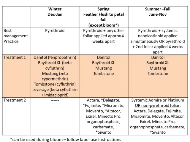 Spring: The first insecticide should be a pyrethroid to get maximum kill of the psyllid, and the second insecticide can be a softer insecticide. However, if the ACP detection situation arises during bloom, treatment choices need to be adjusted to avoid hazards to pollinators.