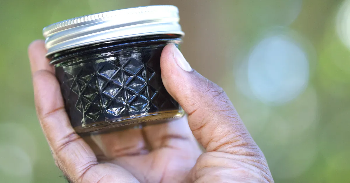 Hand holding a jar of elderberry ja