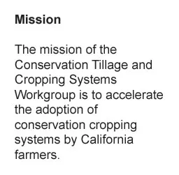 The vision of the Conservation Cropping Systems Workgroup is to achieve resource-preserving and economically viable conservation agriculture systems in California. These systems contribute to greater production efficiencies, reduce negative environmental impacts, ease labor requirements, and result in more vibrant farm economies.