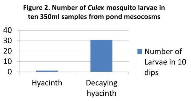 Soon after mesocosm establishment and before weeds were sprayed, we found more mosquito larvae in mesocosms with weeds, as expected. After several initial samples were completed, we applied glyphosate to five of the water hyacinth tanks and five weed-free tanks, and applied fluridone to five of the Brazilian water weed tanks and five weed-free tanks; unsprayed tanks of each type served as controls. We continued to measure invertebrates and the growth and survival of mosquitoes in all tanks over the next few weeks. Afterward, we removed wild mosquitoes with a short-acting larvicide and put nets over the tanks, so that we could measure the growth and survival of a standard-sized group of mosquito larvae in each tank when weeds were actively decomposing. Preliminary results for this part of the study showed that about two weeks into weed decomposition, there were many more mosquito larvae in decaying water hyacinth than in living water hyacinth (Figure 2; difference was statistically significant). Results were inconclusive for Brazilian water weed and so part of the experiment will be repeated in 2016.