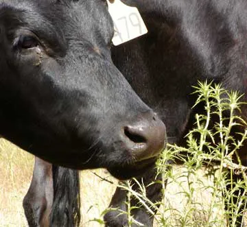 On May 9, cows at the Wick Rathmann Ranch first ate Distaff thistle from black tubs, and on June 3, after waiting for the distaff to bolt, the cows ate it in pasture even though there was plenty of grass nearby. Further test pastures are planned at the Gales’, where a small herd of heifers has been trained.