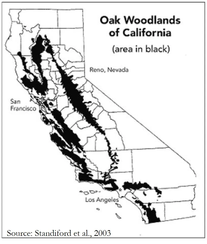 The urban-wildland interface zone in parts of the San Francisco Bay Area supports mature oak woodlands that are dominated by either Coast live oak (Quercus agrifolia) or Oregon oak (Quercus garryana). These oak woodlands provide habitats for a number of wildlife and understory plant species. At various locations they have been harvested for firewood and grazed by livestock in the past. In pre-European settlement times they were burned by Native Americans to facilitate hunting and the collection of acorns.