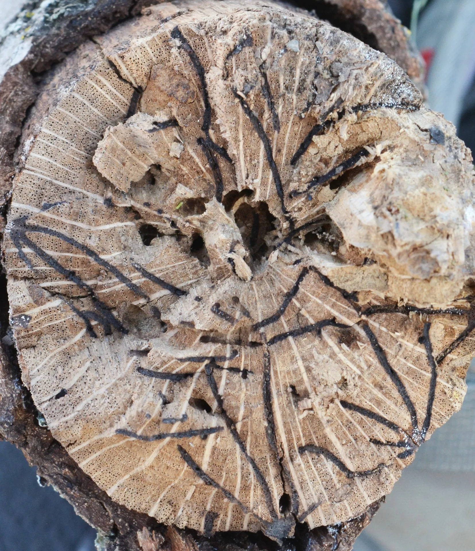 In Northern California, two native ambrosia beetles in the genus Monarthrum also create black-colored galleries in oaks. Monarthrum galleries branch from a single point like a palm leaf and do not cross over neighboring galleries. These native beetles typically only attack trees that are already dead, dying, or diseased.