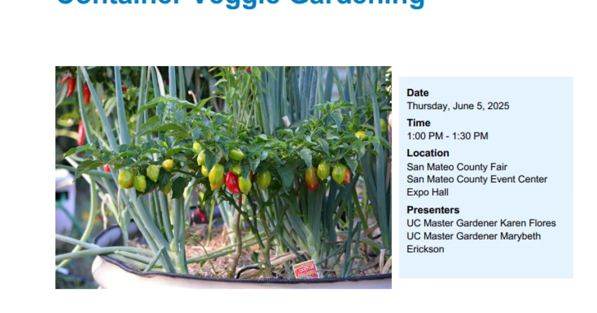 Come see us at the San Mateo County Fair! Learn how to grow a variety of vegetables, herbs and even fruits on a patio, balcony or any small space using containers. We will learn about the containers and which plants to grow for your microclimate and discuss soil needs and watering options. This program is presented by the UC Master Gardeners of San Mateo County.