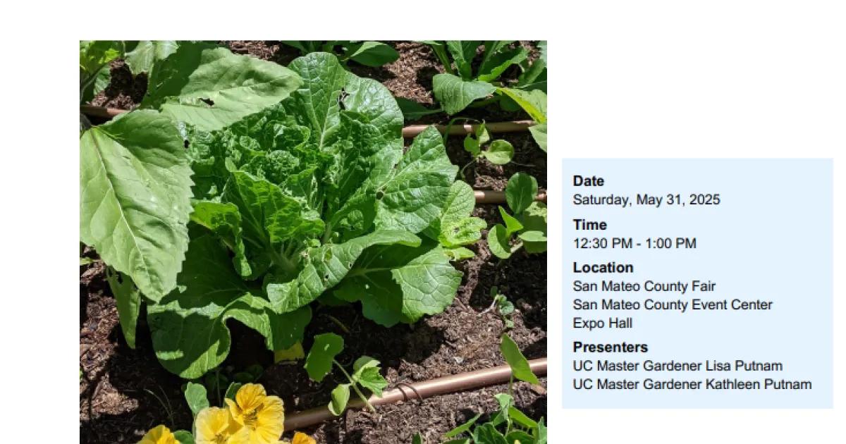 Come see us at the San Mateo County Fair! Find out how to grow fabulous tomatoes, peppers, eggplant, cucumbers, zucchini, winter squash, corn, and more! Learn what is possible to grow and harvest in summer in our area, as well as how to care for your summer garden. We will explore care for seedlings, how and when to harvest, and using regenerative and organic techniques. We will also review how to keep your soil alive.