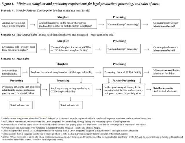 Photo Cred: Sarah KlopatekOne of the first questions to ask is, "How can I sell my beef?". Principally, the ability to legally sell domestic meat and meat products depends on where the animal will be harvested. In California there are three types of slaughter facilities including federally inspected, state inspected, and custom exempt facilities. Of these facilities, only federally inspected facilities allow for the retail sale of meat. However, with AB 2114 producers can now partake in "cow-share" programs and sell the live animal to the costumer in advance of slaughter. (See Figure 1 for a quick reference guide on how you can sell your meat).