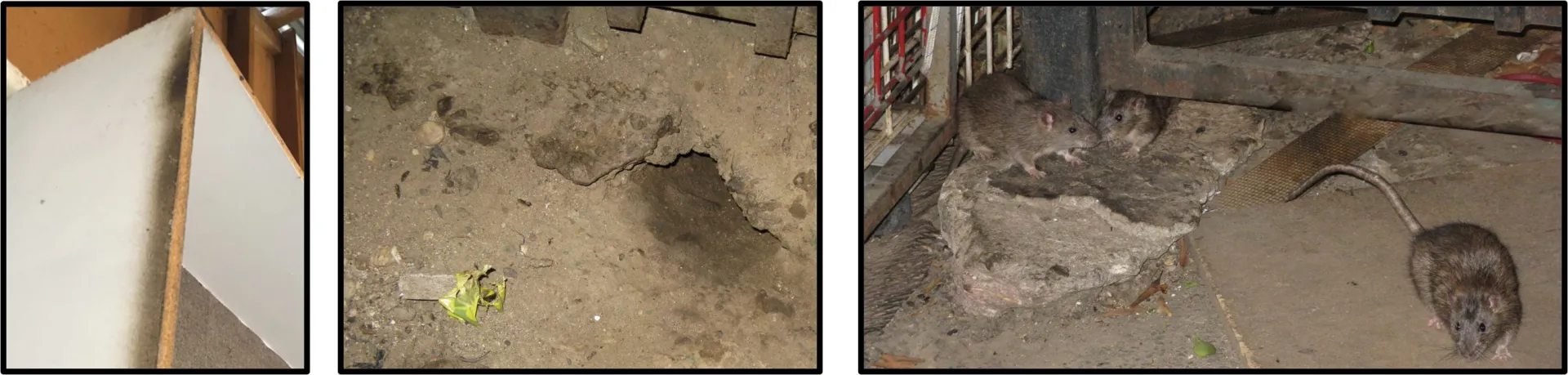 Figure 2: These pictures show signs of what a rat infestation may look like (from left to right) - 1) oils deposited by rats on a cabinet, 2) burrow and scat from rats, 3) three Norwegian rats active in a barn. Photos/courtesy Jim Hartman.