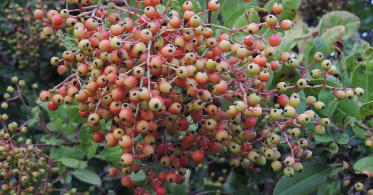 Rhamnus californica, or Coffeeberry, is widespread in coastal California but also happy inland, and tolerates both sun, where it will grow into a dense mounding bush, and shade, which will result in a more sprawling plant. Tiny spring flowers attract beneficial insects and pollinators. The berries start out limey green, ripen to red, and then turn almost black. Birds and small mammals feast on them.