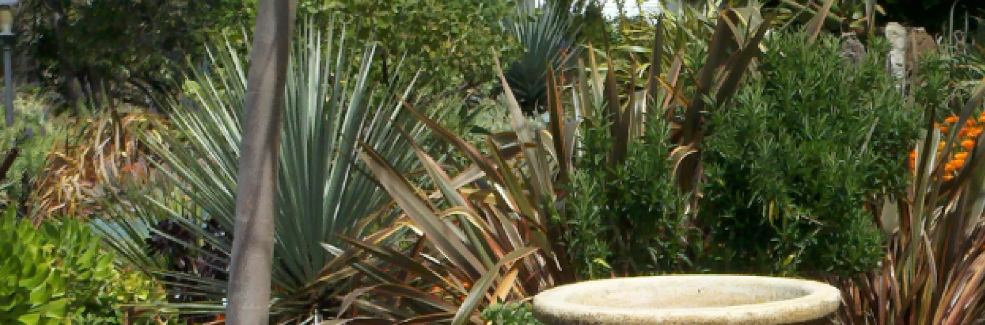 The dramatic Succulent Garden displays succulents from around the world and presents the fascinating variation of forms, colors and textures these plants exhibit.  They are low water use and many bloom in winter offering bees and hummingbirds much needed food. Propagation workshops are often held in this garden.