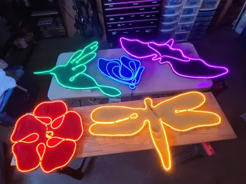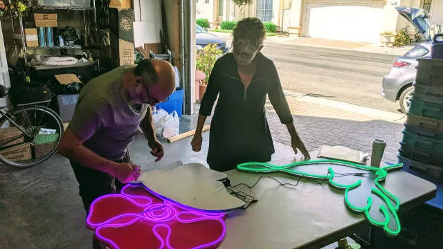 For this year’s festival, Alameda County Master Gardeners Monica Schmid and Roger Marin embarked on a plan to create larger-than-life images of a flower and some beneficial pollinators you might want to have in your garden. While Monica, an accomplished jewelry maker, worked on artistic designs of five selected creatures, Roger investigated ways to bring the creatures to light. He decided to use “Flexible 360 Degree Neon LED Rope Lights” which come in a variety of colors. It was decided to use green for the hummingbird, purple for the flower, blue for the butterfly, yellow for the dragonfly, and orange for the bat. Each would be attached to a ¼-inch plywood cutout painted a complementary color. Supplies were ordered online and everything arrived on time. (Yay! No pandemic delays!)