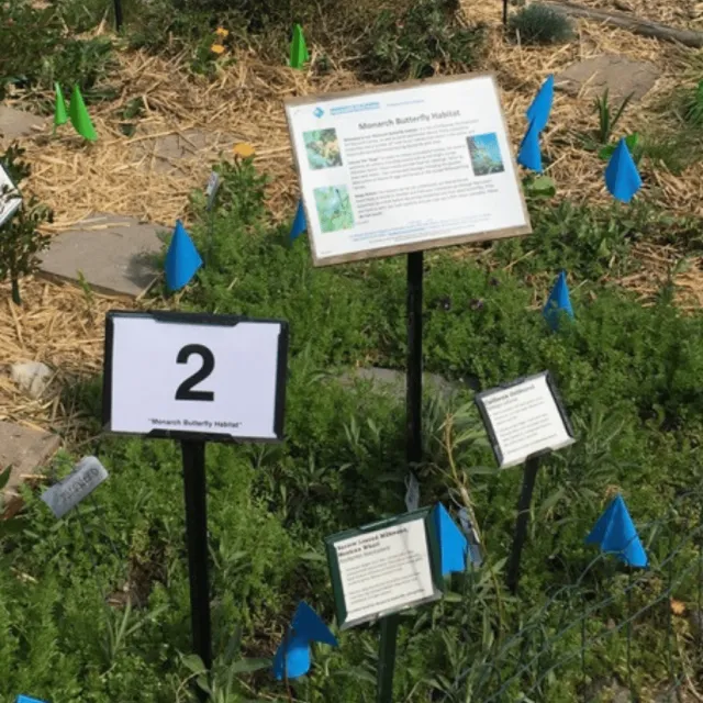 This area contains a variety of milkweeds, the food plant for the larvae/caterpillars of the Monarch butterfly. There are also a variety of flowers to attract adult monarchs in hopes they will lay their eggs on the milkweed. Monarch numbers have declined over time due to loss of habitat and other environmental factors. This station is an example of how home gardeners might provide habitat to help monarchs.