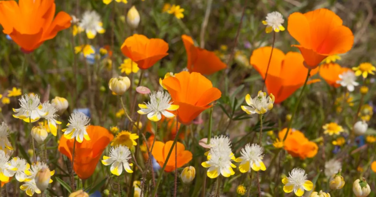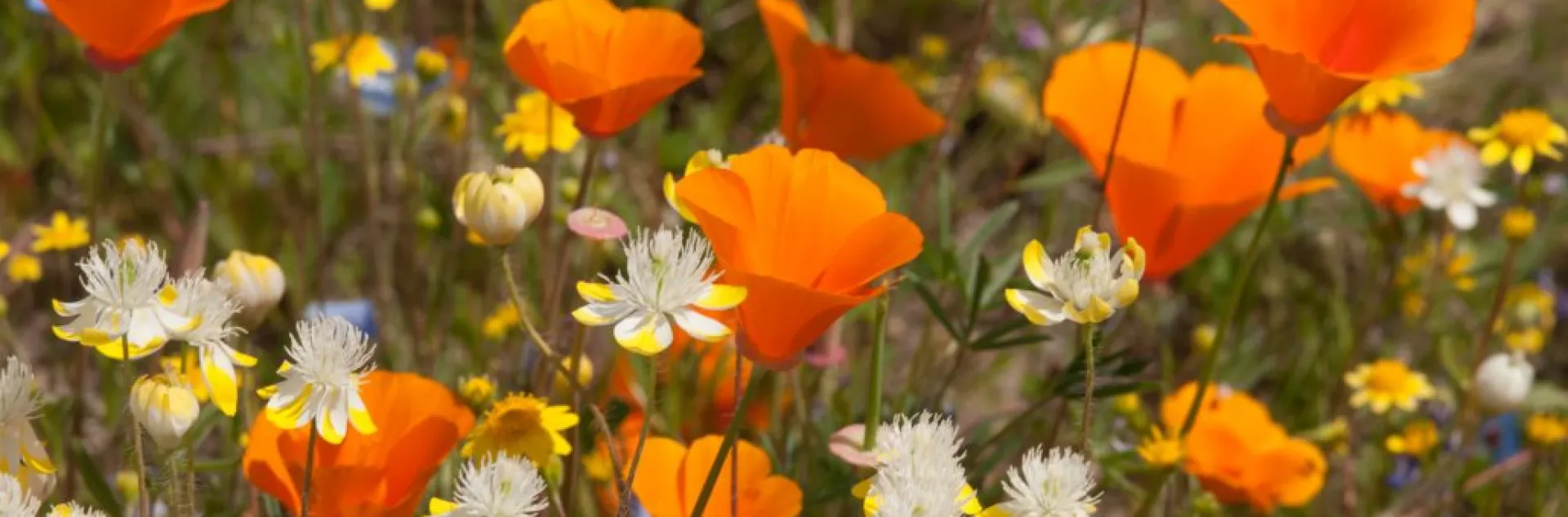What are ephemerals? Plants that sprout leaves and flowers in the California coastal winter and spring, and then fade away by the time hot and windy weather arrives and wildfire risk increases. Maintenance is simple too: plant in a timely way (usually fall), sprinkle water on sprouts and seedlings in case we have a long dry spell in winter, enjoy their blooms, and as they die back trim, collect seeds if desired, and maybe mulch over with non-flammable, well-rotted compost for the summer and fall peak fire season.