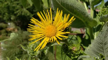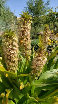 The Perennial Garden draws you in even on a hot summer day. The striking Pineapple Flower with its tall spikes of flowers adds height and interest to any garden, even a container garden. They are great in flowers arrangements, too. The huge red flowers of the Red-leaf Hibiscus pop into focus. Horseheal can grow up to 6 ft. tall. It's broad leaves and height can draw the eye up and its bright yellow flowers are a delight.