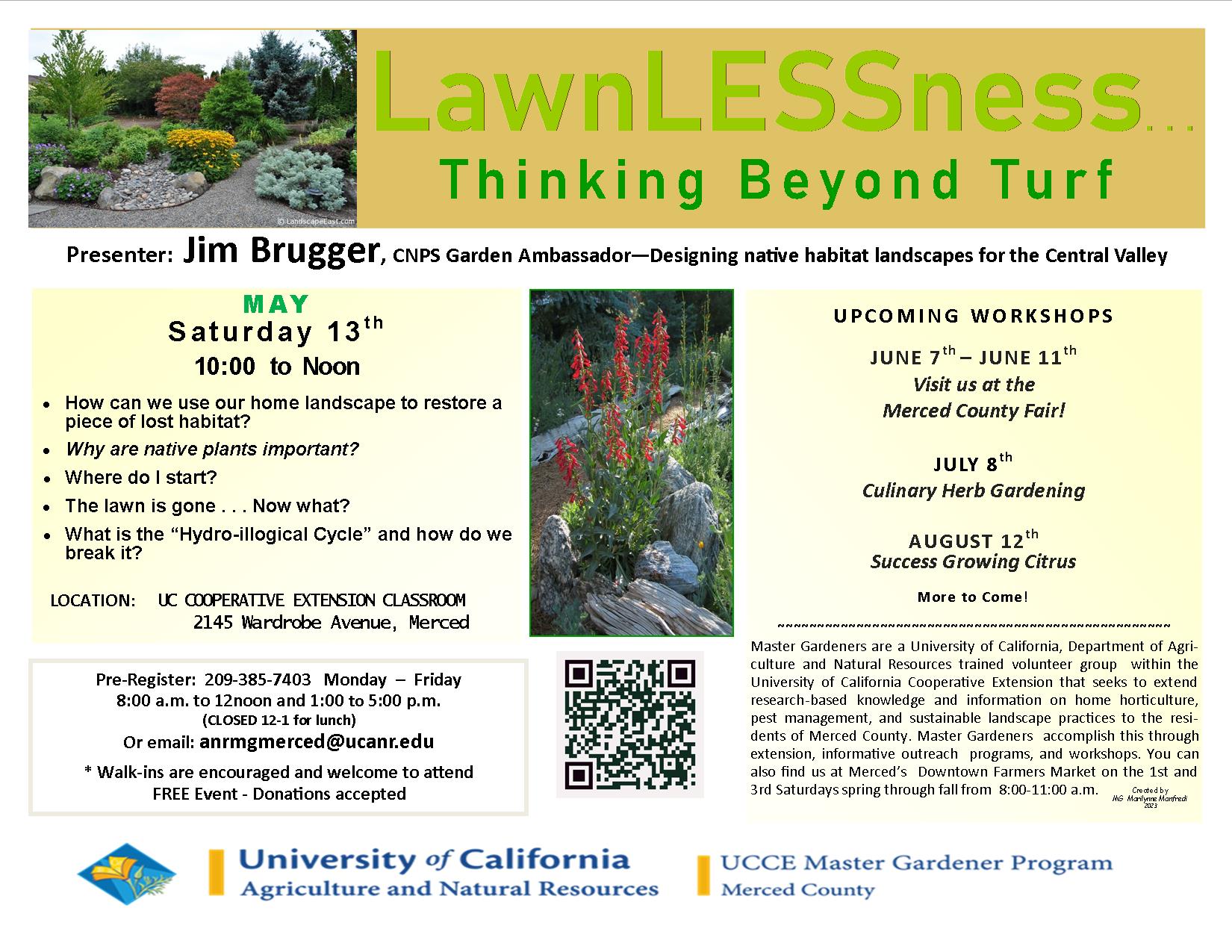 Merced County Master Gardeners hosted Jim Bruger, California Native Plant Society (CNPS) Garden Ambassador on Saturday, May 13, 2023. Jim gave a presentation on lawn removal and native plants, addressing these questions and more: